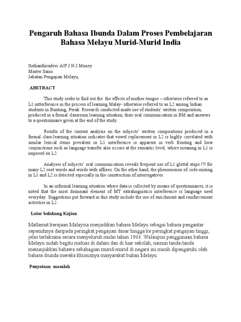Pengaruh Bahasa Ibunda Dalam Proses Pembelajaran Bahasa Melayu Murid Pdf